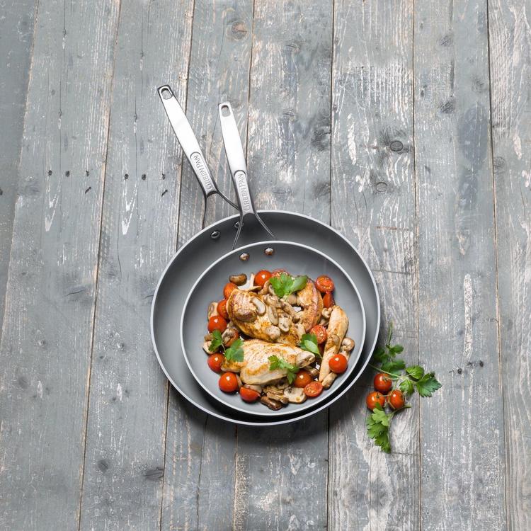 Paris Pro is made of durable hard anodized aluminum for even heat conduction and complete with a matte dishwasher safe coating. Eye catching ergonomic stainless steel handles are riveted for a strong hold, allowing for oven use. Each piece is coated with Thermolon Minerals healthy ceramic non-stick, now metal utensil safe, for an extra durable, healthy cooking surface for every meal.