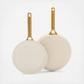 A marriage of design and performance, Reserve Pro is a dynamic refresh of a GreenPan bestseller. Available in more fresh, modern colors than ever, Reserve Pro’s latest innovations make this gorgeous collection a brilliant way to add color to any recipe. Built to deliver world-class results, these pans are crafted from ultra-durable hard anodized aluminum for remarkable durability and incredible scratch resistance. Each pan features GreenPan’s cutting-edge Thermolon™ 9G ceramic nonstick for ultimate nonstick performance, remarkable release, and durability. The first NSF® certified ceramic nonstick, it’s infused with layers of diamonds for 10x longer lasting performance than classic ceramic nonstick and free of PFAS for effortless toxin-free cooking. The domed glass lids offer an easy view of your meal and feature silicone rims that lock in heat and protect the edges of the pans. The luxe gold-tone handles offer a comfortable grip built for oven cooking, plus they’re specially designed so the frypans stack and store easily without scratching. Designed for maximum versatility, these pans clean up in the dishwasher, are oven and broiler safe up to 600˚F (lids 425˚F), and optimized for all stovetops except induction.