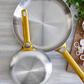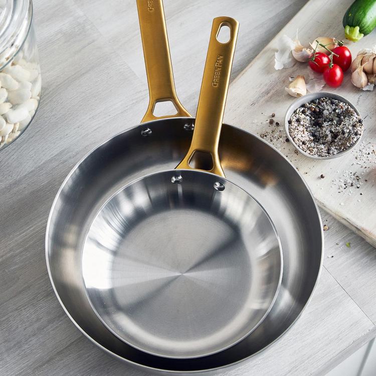 Stylish and durable, these multi-layer frying pans layer quick-heating aluminum cores between durable stainless steel. Brushed gold handles adorn the pan for a modern mixed-metals look on the stove, table or pot rack. The two versatile fry pans ably eggs and pancakes or steaks and asparagus, pairing with the rest of GreenPan's Reserve cookware collection for a well-rounded kitchen with a touch of glam.