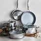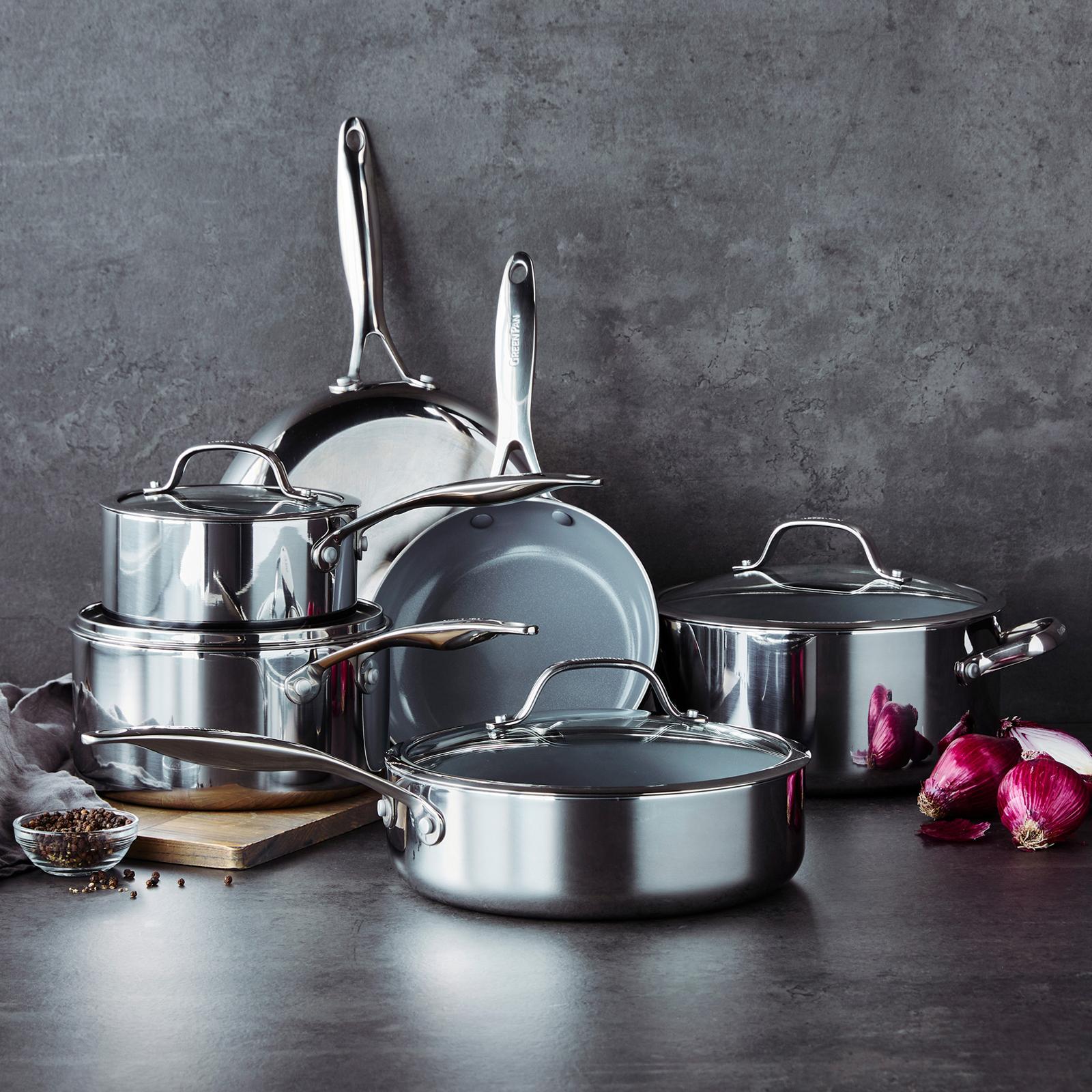 This powerful set delivers all the beauty of stainless steel with incredible nonstick ease. Finished with Infinite, the most cutting-edge ceramic nonstick GreenPan has ever created, this stainless steel set can sear like classic 3-ply then wipe clean. The unique mirror finish on this set’s 3-ply stainless steel bodies adds showstopping style to any stovetop.