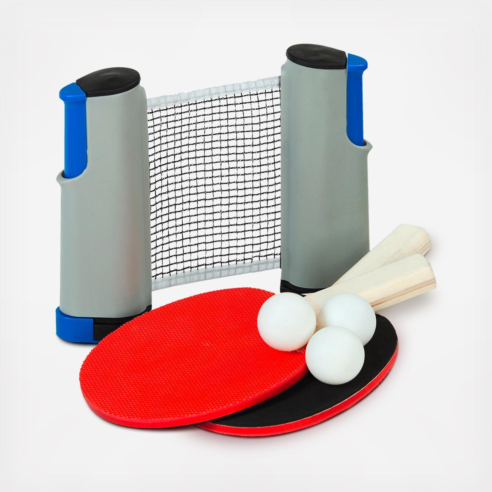 This one-of-a-kind Freestyle Table Tennis Set features authentic style table tennis paddles, 3 table tennis balls and 1 net with adjustable posts. For use on a smooth, flat table top surface, you can play at home or take it on the go for all your adventures. A great way to inject a little friendly competition into your down-time, the included net will fit most tables up to 1.75” thick. Authentic table tennis paddles. Net expands up to 6 in. wide.