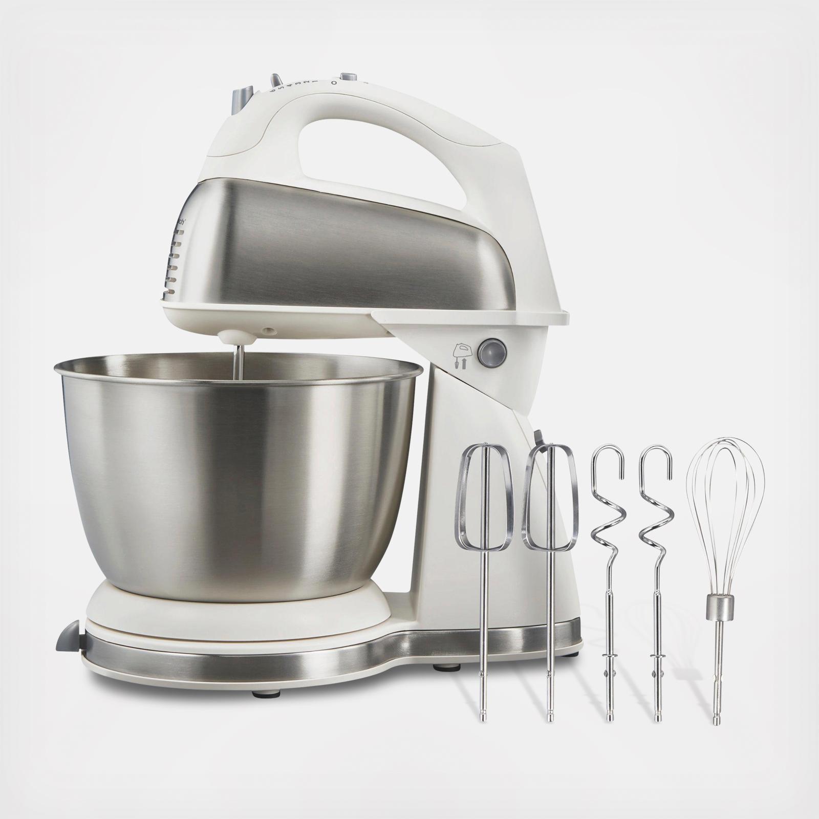 Change to hand mixer by unlocking mixer from base. Comes with 5 attachments for versatile mixing needs. Powerful 290 watt peak power motor supports mixing batter and kneading thick doughs. Shift & Stir lever lets you move bowl side-to-side for thorough mixing. 6 Speeds cover every mixing task. Quick Burst button offers an extra burst of power at any speed. 4-Quart bowl is large enough to accommodate any recipe.