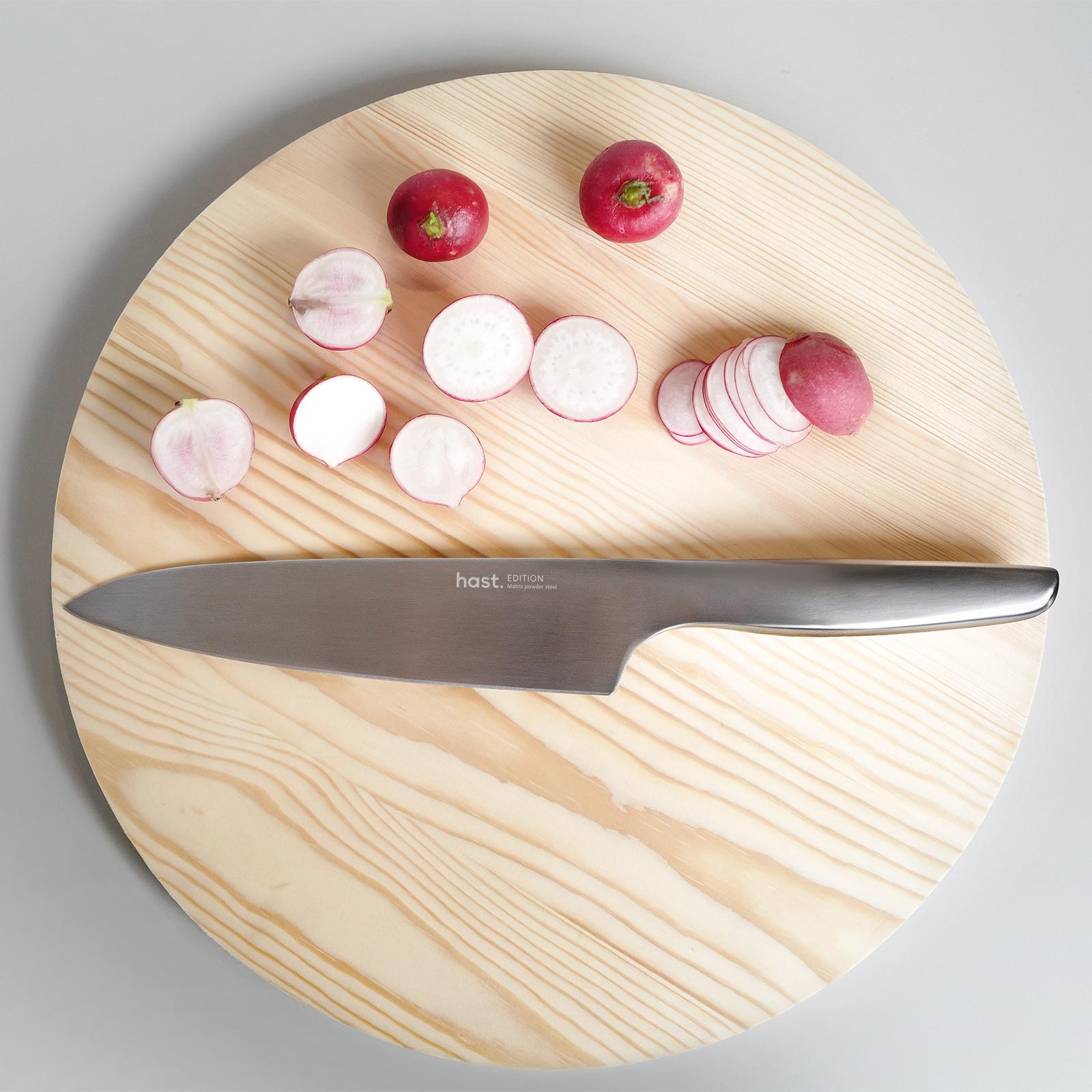 The edition series Chef’s Knife is the perfect everyday knife—ideal for dicing fruits and vegetables, cutting through thick cuts of meat, or even chopping herbs. You might not have a sous-chef just yet, but that doesn’t mean you have to go on without a dependable culinary sidekick. The Chef’s Knife is an all-purpose must-have that will take your cooking to new heights. Whether you are a professional or amateur home cook, a Chef Knife is an essential part of your kitchen collection. Owning a high quality Chef Knife allows you to open the door to new ways of cooking and preparing food that you can't do with regular knives.
