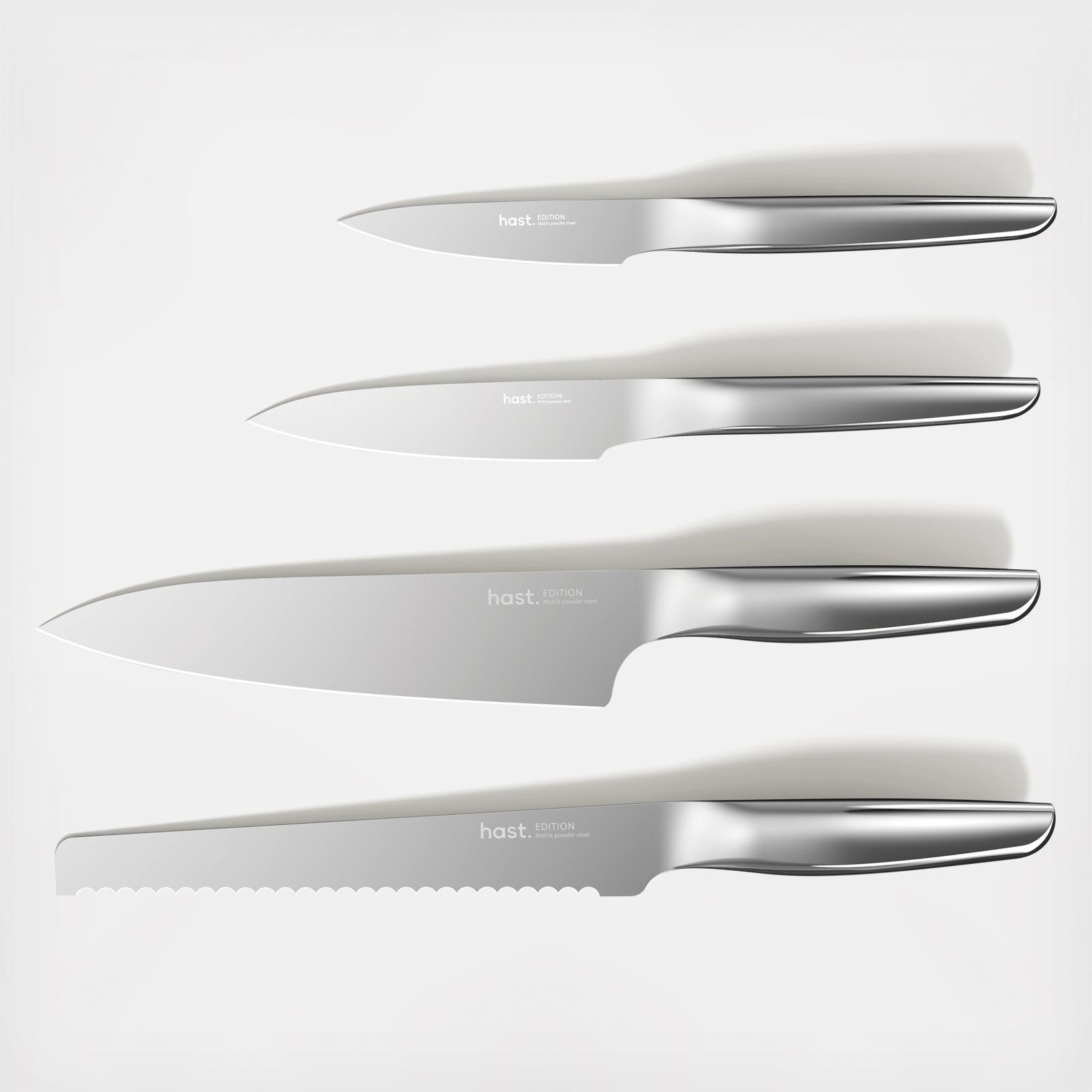 The edition series Modern Knife Set gets your cooking well covered. These four modern knives are perfect for a cook-together session with loved ones. Hast knives are made to the standard of high-carbon Japanese masterchef blades, with ultra thin blades & ultra small edge angles. Hast knives have edge angles smaller than 13° on each side and blade thickness of 0.3mm for the most precise slice. This next-generation steel is the driving force behind Hast knives’ superior sharpness, durability, and ease of use.