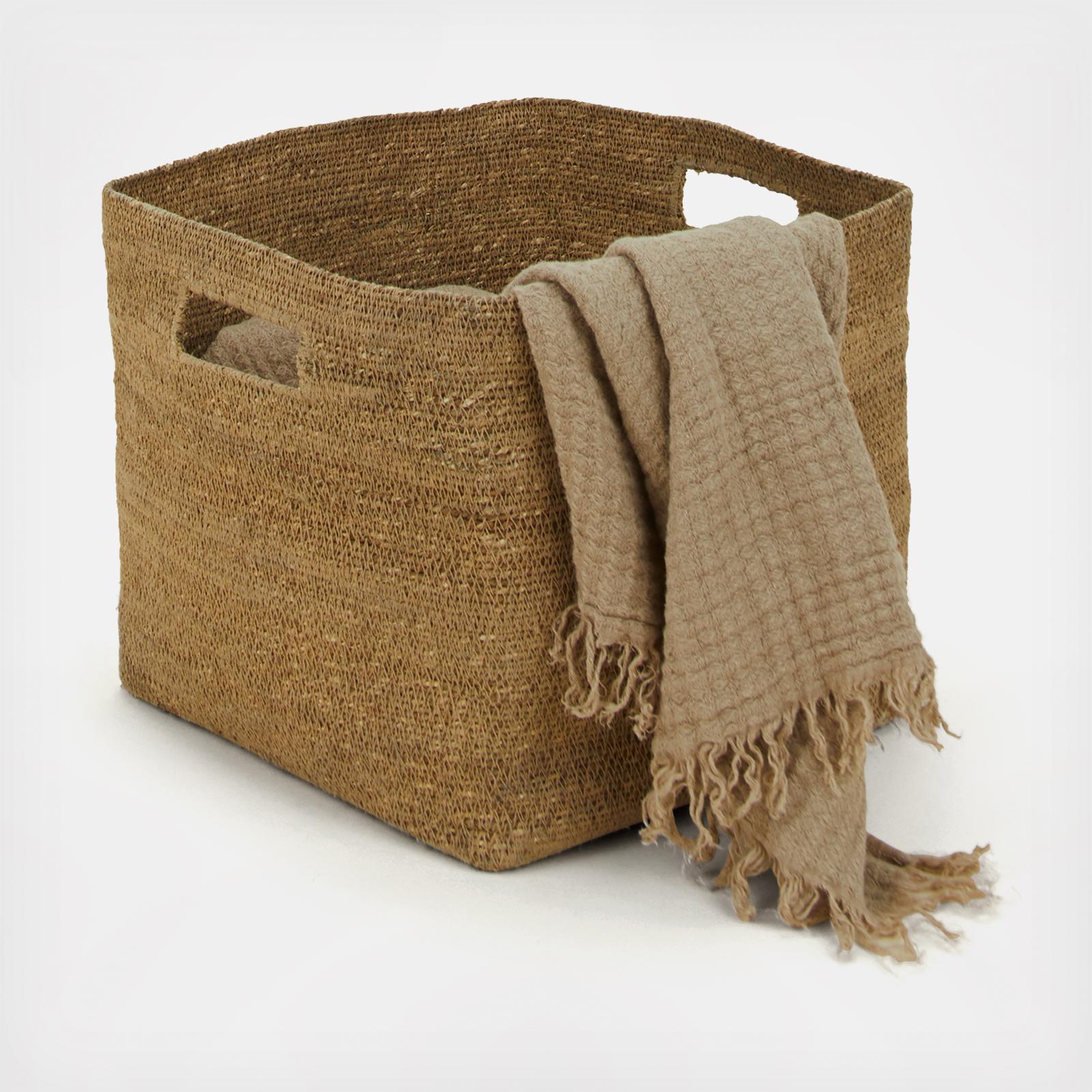 A woven basket for keeping things out of sight. Handwoven sweetgrass. You'll love this size for dog toys, fireplace accessories, or as an extra chic wastebasket. Choose from the natural sweetgrass or colorways achieved by braiding sweetgrass with our favorite HNY hues.