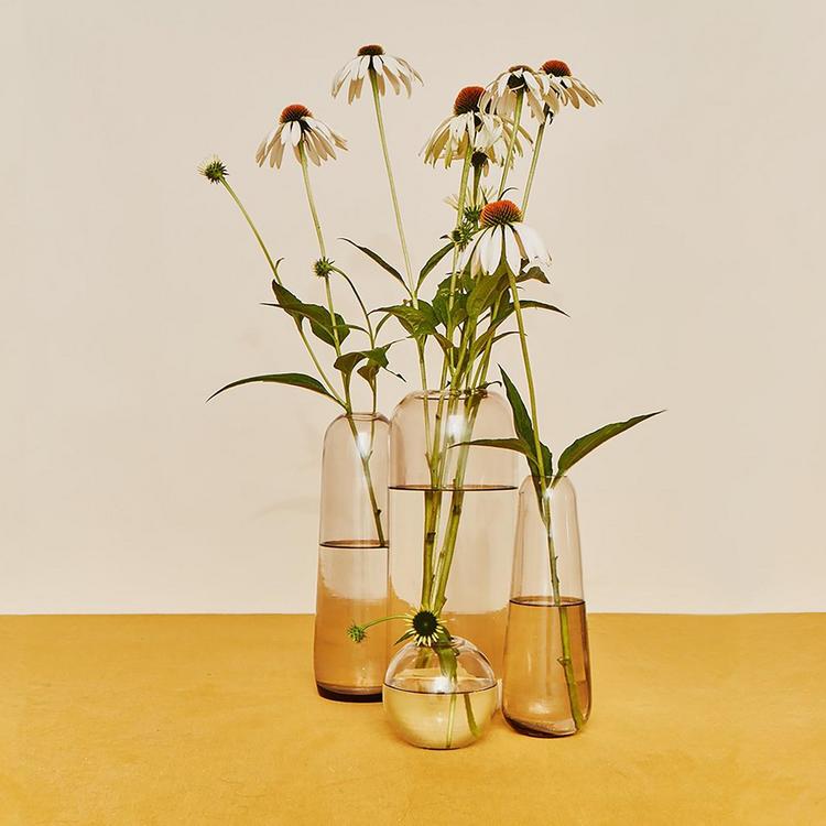 The Aurora Collection was inspired by the Northern Lights after a trip to Iceland. Intended to be grouped and mixed for a play with transparency and to highlight your favorite flowers, stems or weeds. Each piece is blown by hand with clear, smoke, or blush tinted glass and each piece is slightly different than the rest.