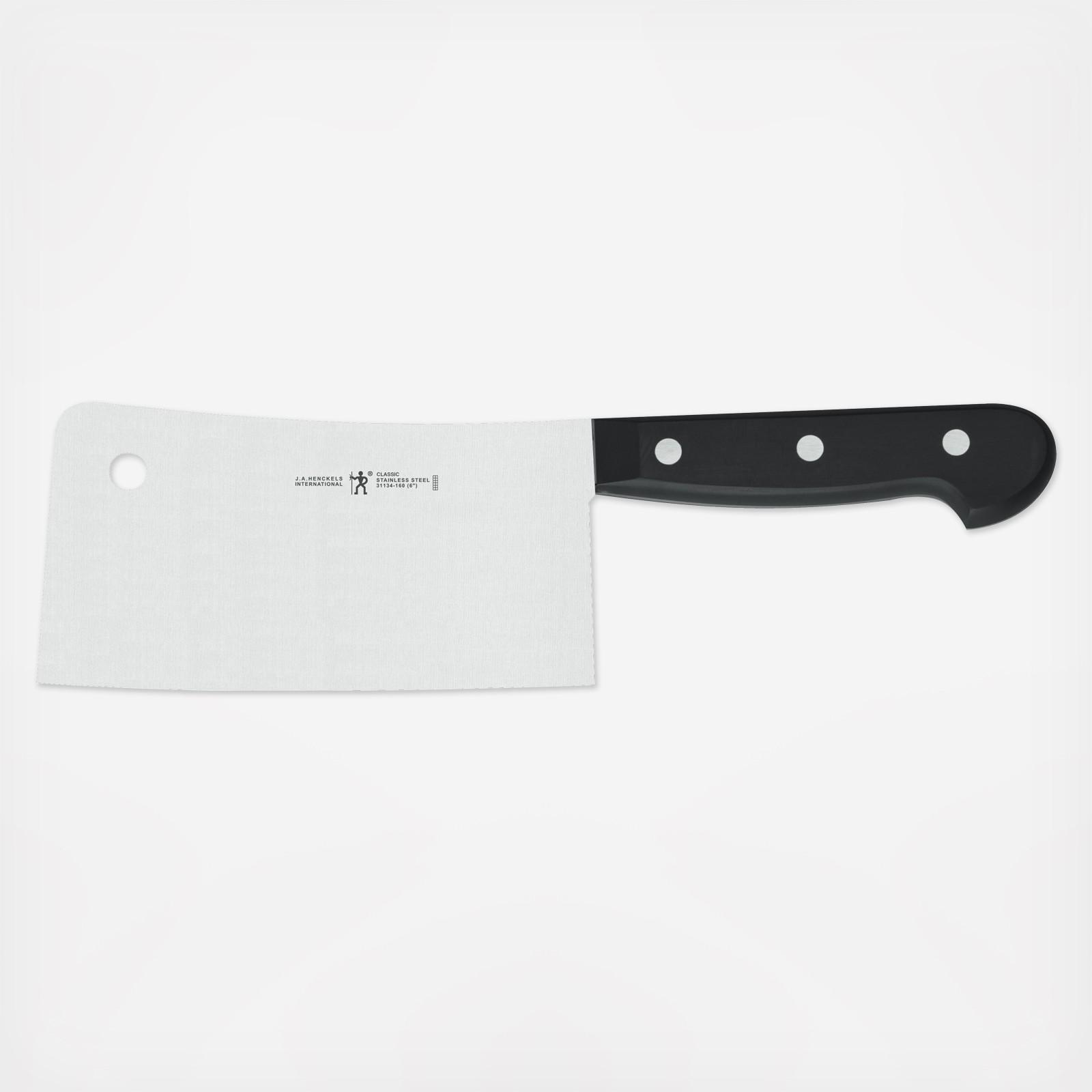 J. A. Henckels International Classic knives are made of high quality German carbon no-stain steel. The one-piece traditional forged construction provides durability and features a full bolster for added weight, comfort, and safety. Traditional three rivet handle with exposed full tang and full bolster provide a comfortable grip with balance and support. The meat cleaver features a sturdy, broad and rectangular blade that is suitable for cutting large pieces of meat and can also cut through bones.