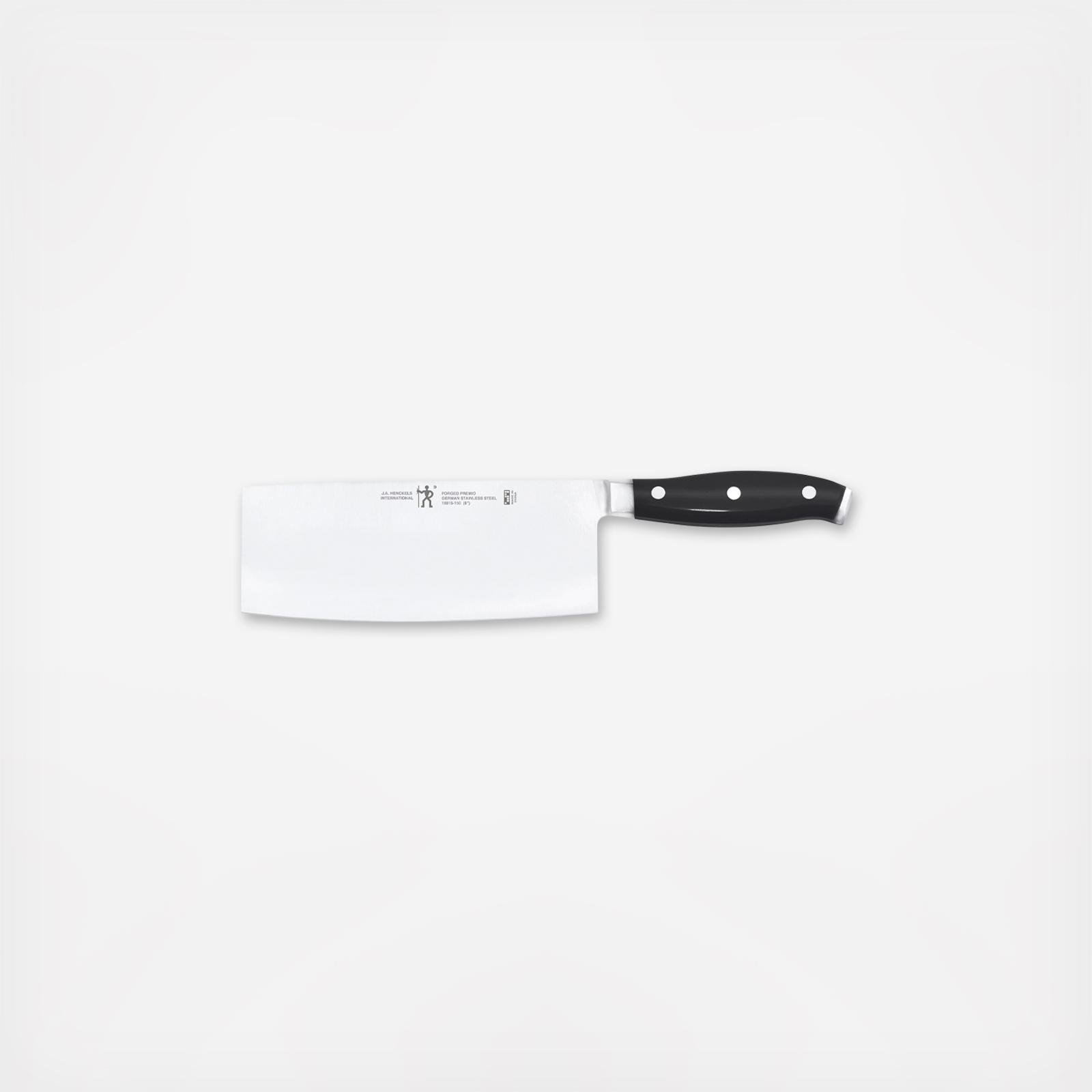 The Henckels International Forged Premio 6 in. Meat Cleaver allows you to cut meat with confidence. Perfect for prepping large pieces of meat, the broad, rectangular blade also cuts through bones. The forged bolster construction seamlessly transitions from blade to handle for durability and balance. Stamped with the single man Henckels' logo, this Halberdier symbolizes Forged Premio's superb quality at a remarkable value.