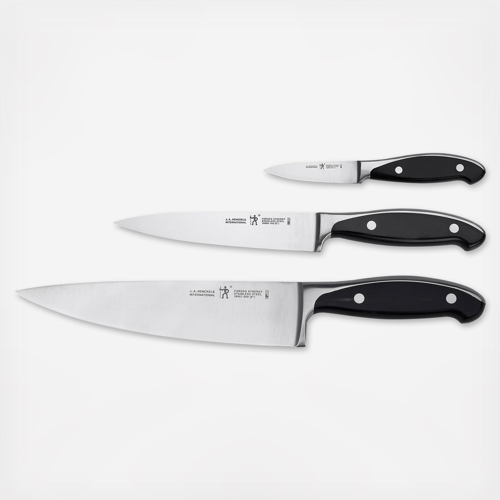 Prepping is easy with the Henckels International Forged Synergy 3-Piece Starter Knife Set. The all-rounder Chef's Knife is perfect for chopping herbs and dicing onions while the Utility Knife is ideal for slicing cheese. The Paring Knife is excellent for detailed work - like peeling apples or removing blemishes.