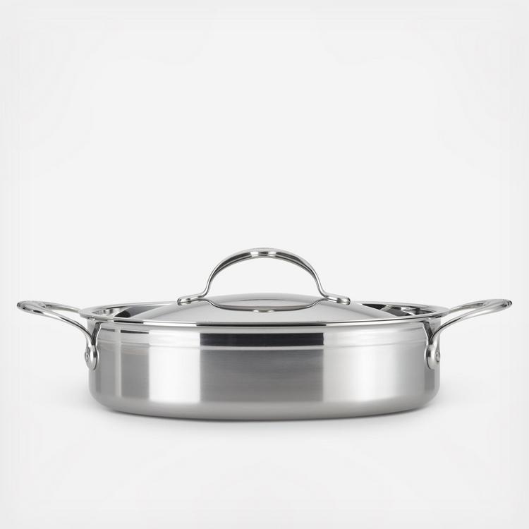 For superior form and function from optimized cold forged construction, equip the kitchen with the ProBond Forged Stainless Steel Sauteuse. Handcrafted in Italy to meet the highest quality standards, ProBond cookware is constructed from cold-forged steel, providing a thicker base for even heat distribution, thinner side walls for lighter weight, and thicker rims for increased durability. Induction-stove suitable and oven safe to 500°F, this completely innovative ProBond saute pan is triple bonded with a pure aluminum core for maximum heat conductivity with sealed, flared rims for easy pouring. The ideally weighted, ergonomic handles prevent twisting and turning when lifting larger portions, and flush rivets make for easy cleaning and easier stacking of cookware in the cabinet to minimize surface scratches. A stainless steel lid seals in heat and moisture, and coordinates beautifully with the brushed stainless steel exterior to keep your cookware looking like new for a lifetime. For the unmatched durability and superior performance you want in professional cookware, reach for the innovative ProBond Forged Stainless Steel Sauteuse.