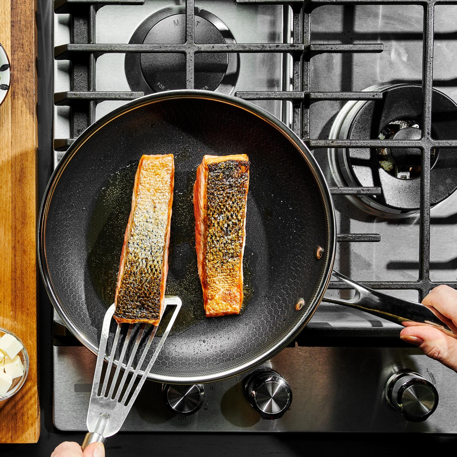 HexClad's patented cookware design technology is unmatched in today's world of cooking. Simply put, it is the best cookware you can buy. So how does it work? A well-seasoned HexClad pan will provide the cooking experience of stainless steel, non-stick and cast iron in a single pan. Using a proprietary laser etching process, we create our patented HexClad hexagon design on the cookware. This unique design creates a series of peaks and valleys. The peaks are your stainless steel, which will give you that great golden-brown sear and also protect the pan against peeling and flaking. In the valleys is the nonstick surface, which provides your pan with easy cleanup and the ability to cook with less butter, grease or oil. HexClad utilizes a tri-ply, clad style pan. We start with a layer of magnetic stainless steel. This way it not only works on gas and electric stoves but also on newer magnetic induction cooktops. Next, we have a middle layer of aluminum, which acts as the heating element, providing the pan with nice, even heating. We then sandwich this aluminum layer between one more layer of steel.