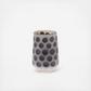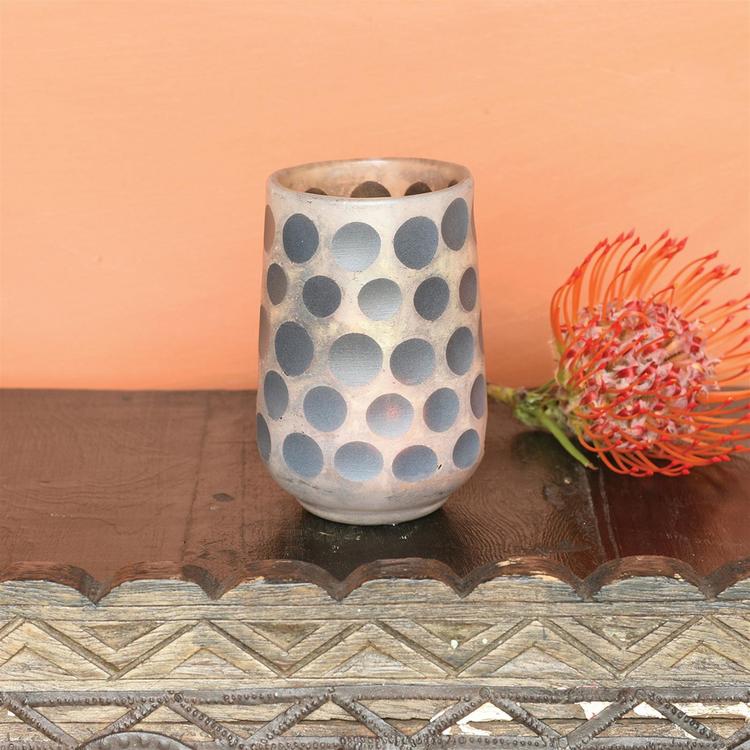 A frosted glass vessel is artfully etched in an organic polka dot pattern. Enjoy the soft glow from this unique glass votive.