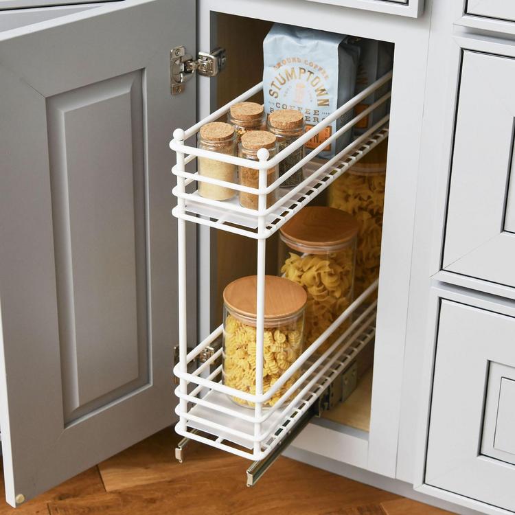 This innovative organizer features a durable paint-finished steel construction that combines durability and style, making it an excellent addition to any kitchen or pantry. With its 2-tier design, this organizer provides ample storage space to accommodate a variety of items. From cans and dry goods to cleaning essentials, keep supplies neatly organized and easily accessible. Compatible with most standard kitchen cabinetry, this organizer is designed to mount directly onto hard surfaces. Its compact size and versatile mounting options make it suitable for a wide range of cabinet configurations. Crafted from durable steel, this organizer is built to withstand daily use. The durable powder paint coating not only enhances its aesthetic appeal but also provides added protection against scratches and corrosion. With a maximum weight capacity of 33 pounds, this organizer is built to handle heavy loads without compromising stability. Installing it is a simple process, as all the necessary mounting hardware is included. Follow the provided instructions, and the organizer will be ready for use in no time. To further enhance functionality, the organizer comes with removable PEVA liners. The liners act as protective barriers, guarding against leaks and spills, while also making it easy to clean and maintain.