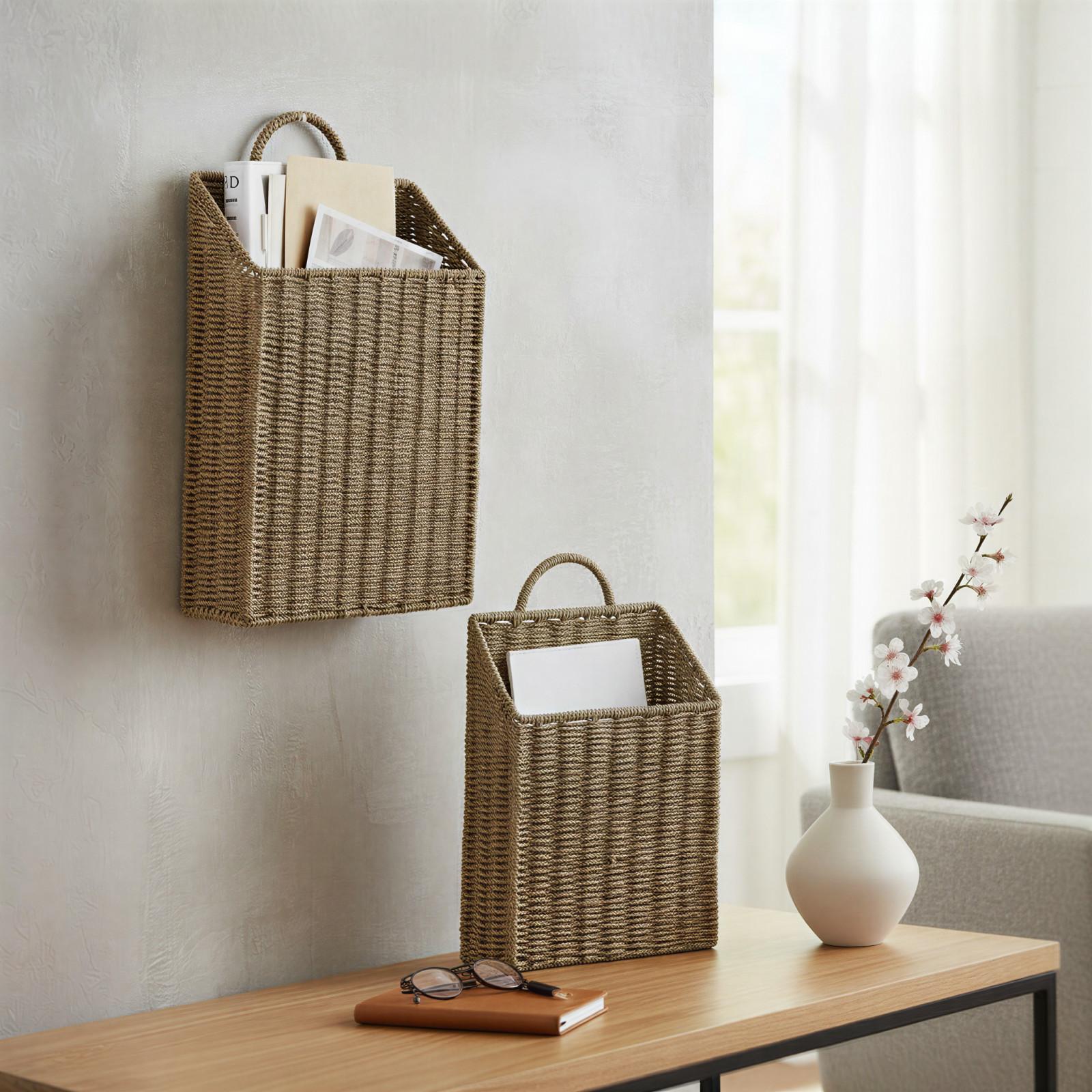These rectangular wicker hanging baskets offer a smart way to add multipurpose storage options to your home that double as decor! The natural fibers contribute an earthy aesthetic while maintaining durable durability over time. This set of 2 hanging baskets provides a small and medium-sized basket made of handwoven seagrass around a sturdy metal wire frame. These fibers are an attractive alternative to metal or plastic containers, providing easily accessed and decorative storage options. Their metal frames provide excellent structure to help the baskets retain their original, beautiful shape. Both of these baskets have convenient handles that can be used to hang them on the wall or carry them from the mailbox and back. The baskets can be hung beside the front door to hold mail, in the garage to hold keys or in the bathroom to hold magazines. Their design lays flat against the wall for a sleek profile. They can also be set upright on the entryway table or beside a lounge chair. Due to its natural fibers, each item might vary in color and size. While these baskets are perfect for sorting mail, they could also be used to hold crossword puzzles, baking recipes, to-do lists and much more. The earthy seagrass blends well with a variety of color schemes and themes. These wicker hanging baskets are the perfect additions to anyones decor.