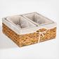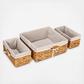 This set of three wicker storage baskets allow you to add organization to any space. This set comes with one large basket and two small baskets, both of which can nest side by side inside the larger basket.