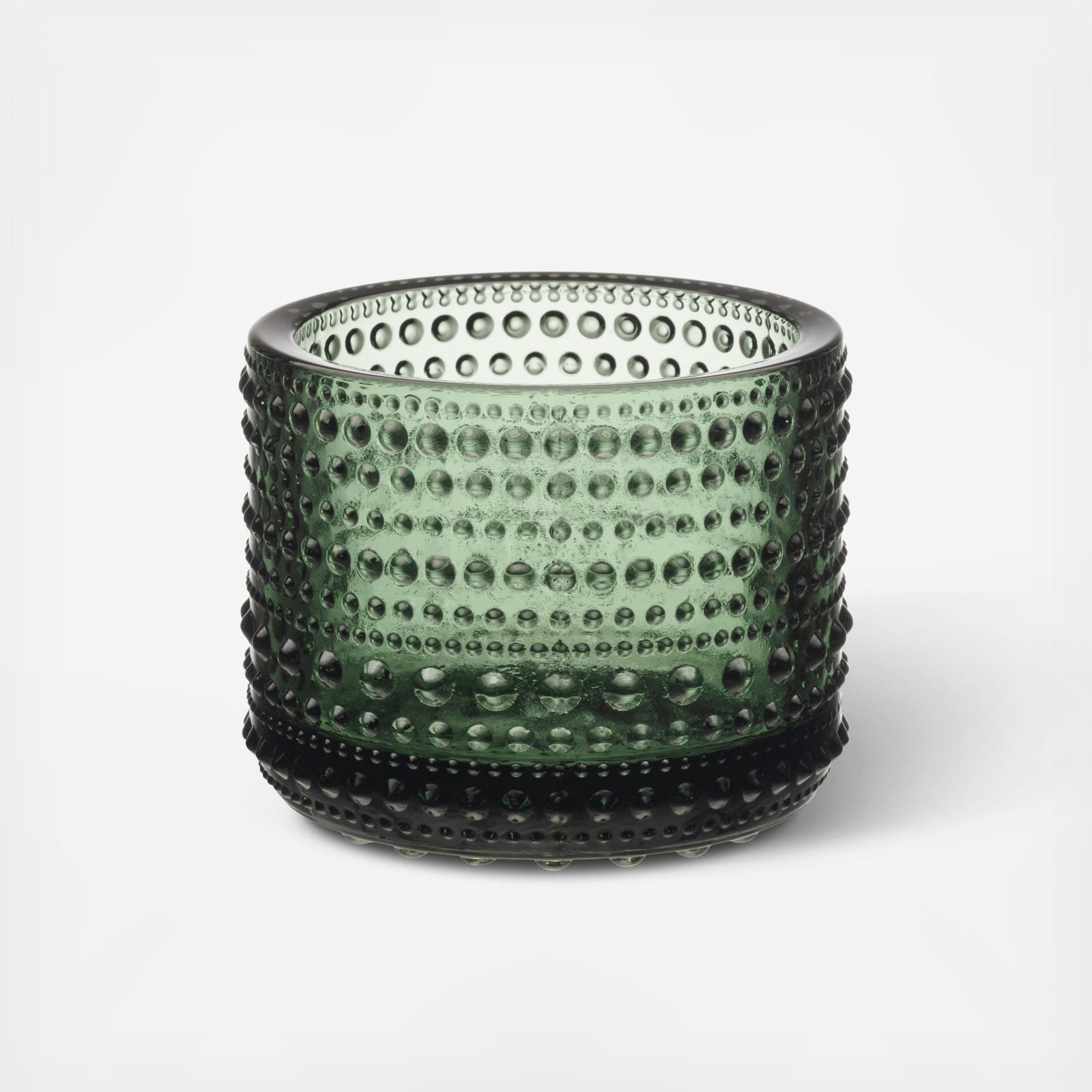 Design legend Oiva Toikka’s unique Kastehelmi collection came from Toikka’s quest to find a design that would hide joint marks in glass. The groundbreaking result was a distinct pattern featuring rings of delicate raised glass droplets that resemble strings of dewdrops glistening under the morning sun. Kastehelmi (“dewdrop” in Finnish) plays with light, bringing out the true reflective beauty of the glass. Iittala’s beloved Kastehelmi collection offers a wide range of versatile, tactile pieces that are both functional and decorative. The soft glow of the Kastehelmi tealight candleholder creates warm ambience. The set colour is inspired by Nordic nature. Striking alone or grouped in a collection. A great gift. Oiva Toikka's beloved Kastehelmi charms in the elegant colour of the Nordic forests. The elegant shade makes the tealight candleholder's glass bead surface sparkle. Combine the different coloured candleholders and create your own personal ensemble. A timeless gift for a friend or loved one.
