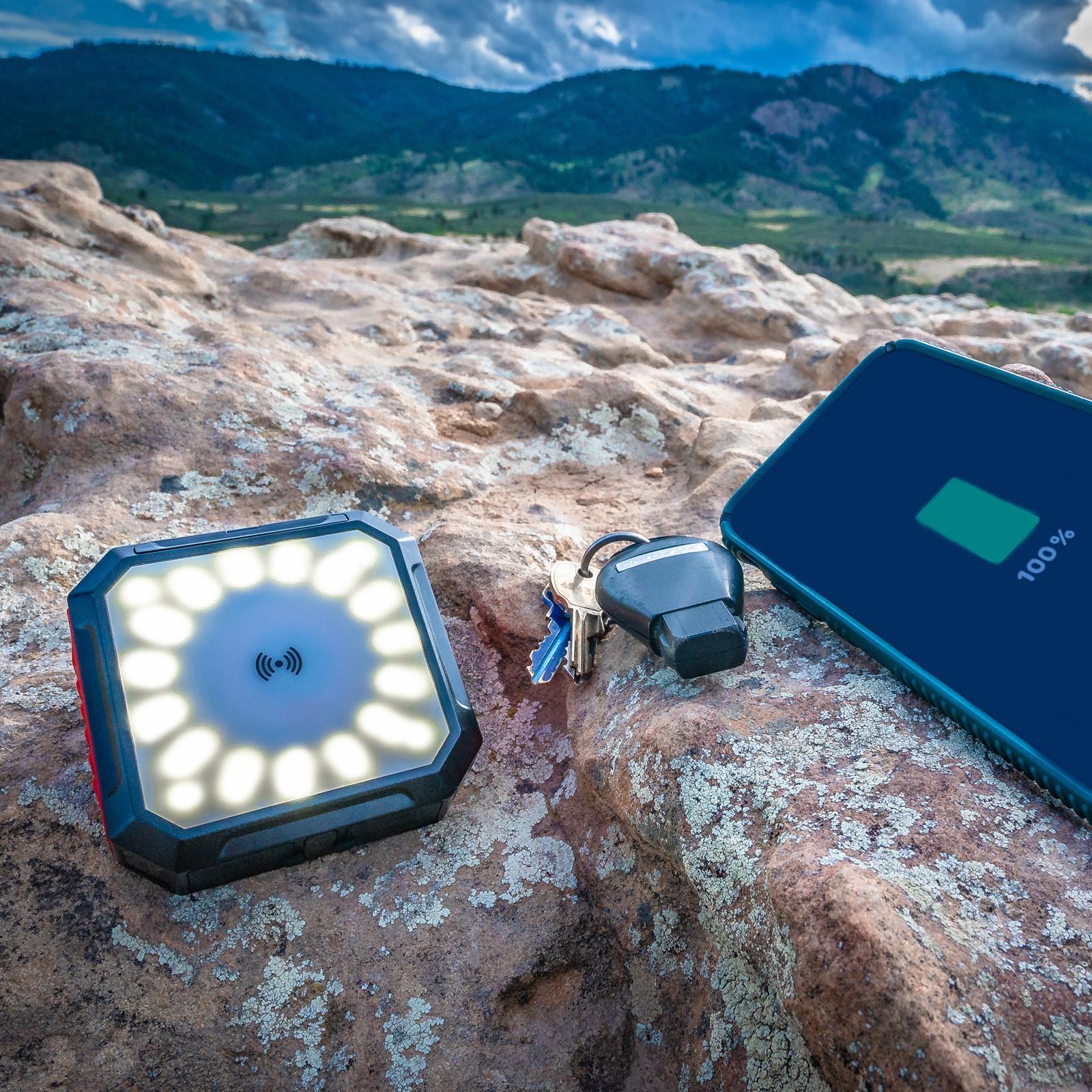 This all-in-one solar power bank, flashlight and wireless charger bring you unique utility and reliability on any camping trip or outdoor night excursion. With 40-hours of battery life, the powerful LED lantern provides light all the way through sunrise. The convenient design of this power bank even allows you to charge three devices at once! Set your phone onto the power pad and plug into the two USB charging inputs to power up devices for the whole adventuring party.