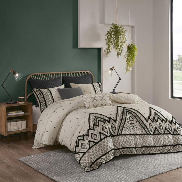 Create a modern-boho eclectic look in your bedroom with the Marta 3-Piece Cotton Comforter Set. The cotton and flax linen comforter and shams features a diamond print with chenille textured trim that adds dimension and creates a globally inspired look. The cotton flax linen fabric creates a crisp, natural texture. Hidden bar tacking gives the comforter a clean, duvet-like finish. This cotton comforter set combines style and comfort to elevate your bedroom.
