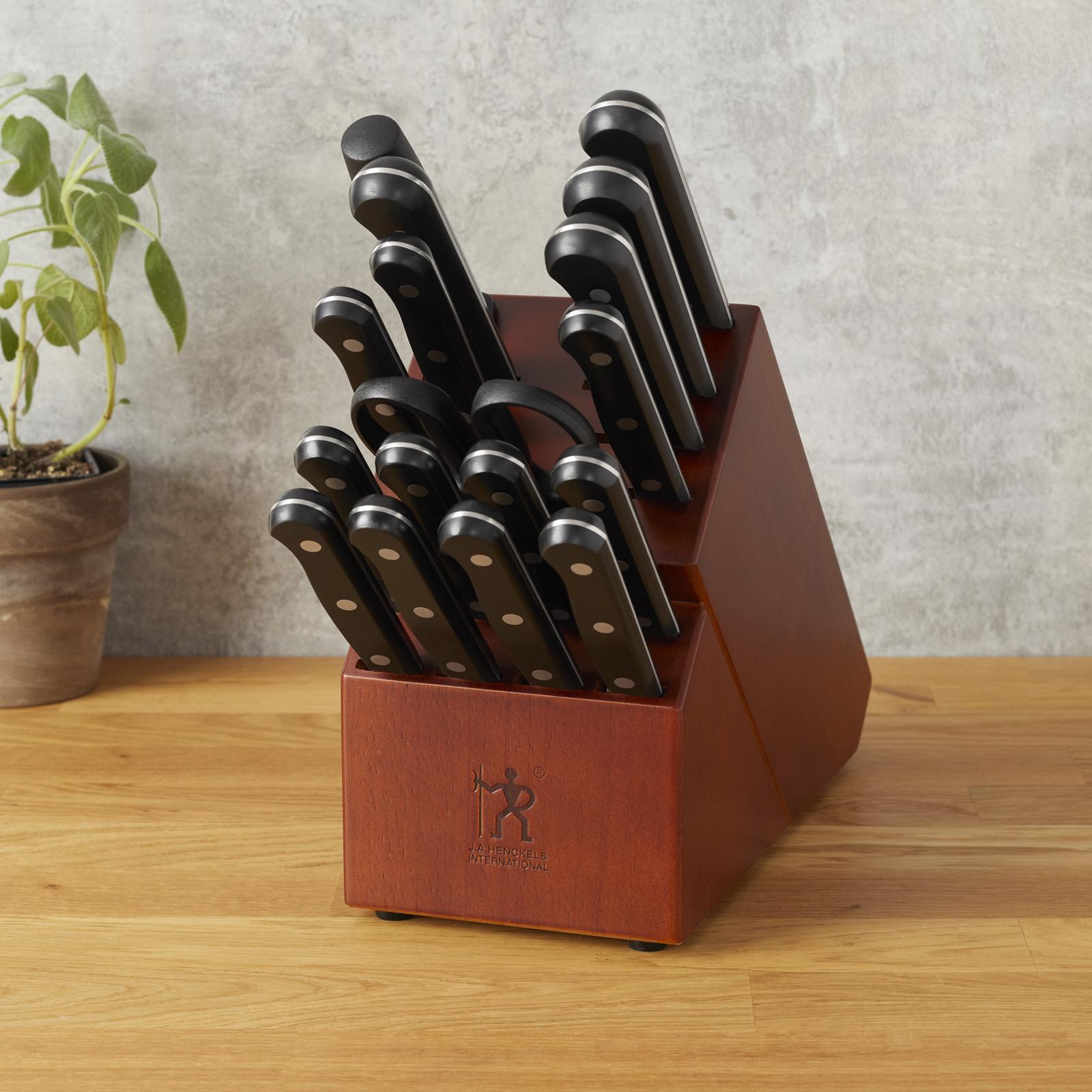 Henckels has been making high quality, everyday knives at an exceptional value. The Henckels solution knife set is stocked with tools to tackle every kitchen task. The handsome hardwood block handily keeps this useful knife collection within reach on your countertop. The single-piece, precision-stamped knife blades are lightweight without sacrificing strength and durability. Along with the ergonomic, traditional triple-rivet handle. Enjoy maximum maneuverability and fatigue-free cutting. Honed for long-lasting sharpness, the fine-edge blades boast precision cutting. Curved for comfort, the break-proof, triple-rivet handles are pleasant to grip, giving you the control you need to slice through tougher cuts with ease.