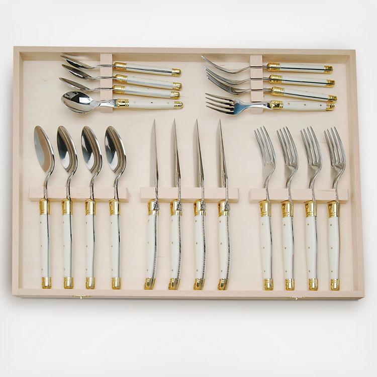 This twenty piece heavy-gauge flatware set with ivory handles makes for a great gift. Each set contains knives, soup spoons, dinner forks, salad forks, and coffee spoons and is enclosed in a beautiful wooden box. These knives, forks, and spoons have a gauge of 2.5mm and are rust resistant.