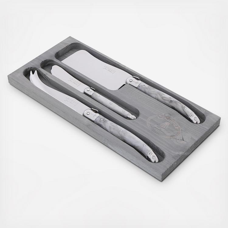 This stylish three piece cheese set includes a cleaver, cheese knife, and spreader all packaged in a wood box for easy storage. The Laguiole knife has been used in the south of France for over 200 years. Jean Dubost's family, inspired by the traditional peasant tool, has been crafting the artisan blades since 1920. Surrounded by legend and myth, the Laguiole knife still carries the mark of its ancestors. A bee that is found engraved on all Laguiole products, was originally part of Napoleon Bonaparte's imperial seal. The blade, made of high-grade stainless steel, is stamped, then ground and then polished in over 25 different manual production stages. Recently, the Laguiole mark has expanded to include flatware, wine waiters and cutlery crafted with the same quality and craftsmanship. Trusted and revered in kitchens and restaurants through-out France, the Dubost family is happy for the Laguiole tradition to finally reach this side of the Atlantic.