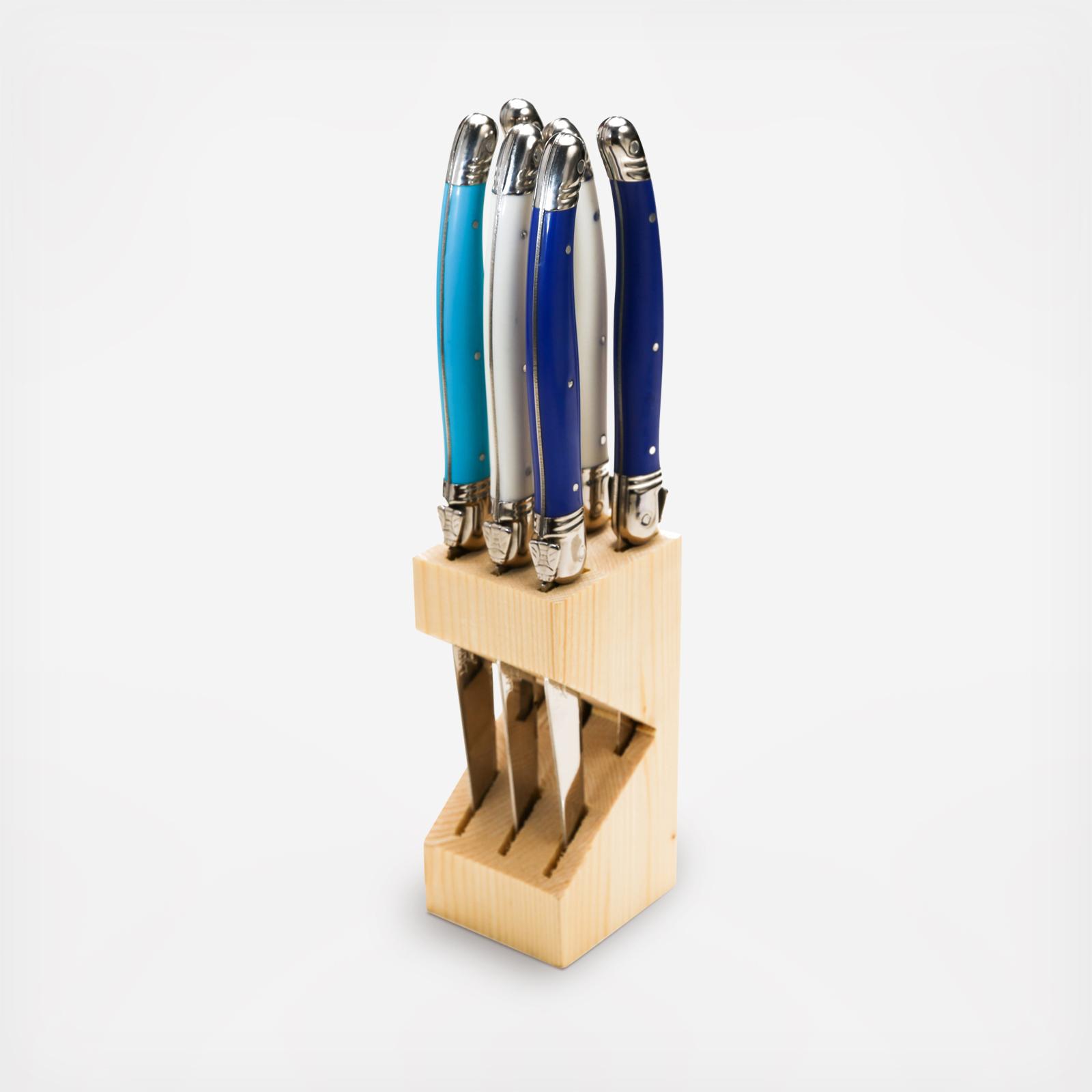 This set of steak knives is perfect for any kitchen. Each knife has a gauge of 1.2mm, is made from high-grade stainless steel, is rust resistant, and is dishwasher safe. This set comes with a wood knife block, so you can safely store your knives in between each use. The Laguiole knife has been used in the south of France for over 200 years. Jean Dubost's family, inspired by the traditional peasant tool, has been crafting the artisan blades since 1920. Surrounded by legend and myth, the Laguiole knife still carries the mark of its ancestors. A bee that is found engraved on all Laguiole products, was originally part of Napoleon Bonaparte's imperial seal. The blade, made of high-grade stainless steel, is stamped, then ground and then polished in over 25 different manual production stages. Recently, the Laguiole mark has expanded to include flatware, wine waiters and cutlery crafted with the same quality and craftsmanship. Trusted and revered in kitchens and restaurants through-out France, the Dubost family is happy for the Laguiole tradition to finally reach this side of the Atlantic.