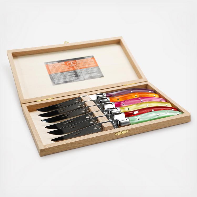This set of steak knives is perfect for any kitchen. Each knife has a gauge of 1.2mm, is made from high-grade stainless steel, is rust resistant, and is dishwasher safe. This set comes with a wood knife block, so you can safely store your knives in between each use. The Laguiole knife has been used in the south of France for over 200 years. Jean Dubost's family, inspired by the traditional peasant tool, has been crafting the artisan blades since 1920. Surrounded by legend and myth, the Laguiole knife still carries the mark of its ancestors. A bee that is found engraved on all Laguiole products, was originally part of Napoleon Bonaparte's imperial seal. The blade, made of high-grade stainless steel, is stamped, then ground and then polished in over 25 different manual production stages. Recently, the Laguiole mark has expanded to include flatware, wine waiters and cutlery crafted with the same quality and craftsmanship. Trusted and revered in kitchens and restaurants through-out France, the Dubost family is happy for the Laguiole tradition to finally reach this side of the Atlantic.