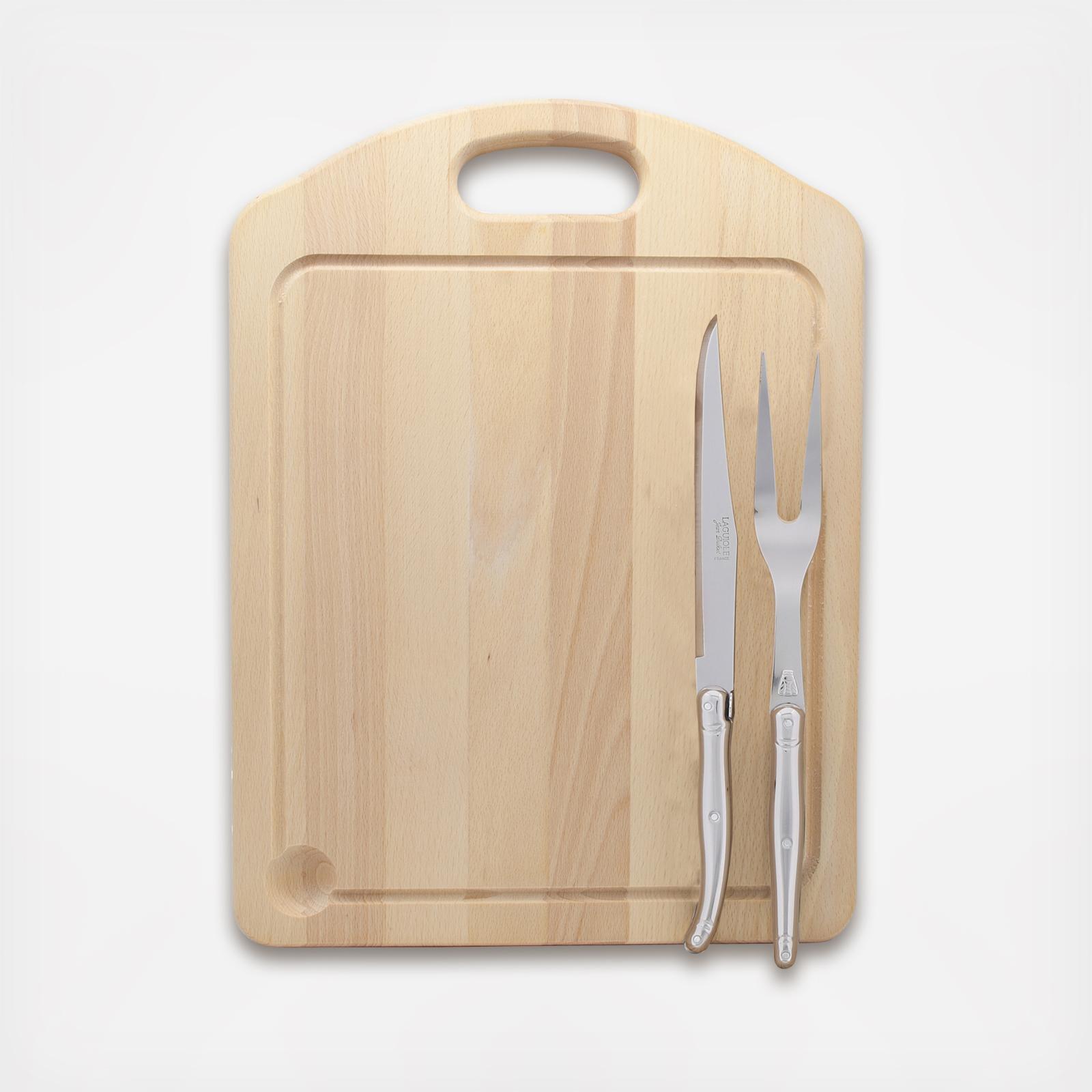 Slice and serve with ease with this carving set and board by Jean Dubost. The carving knife and fork both feature the iconic Laguiole bee design and will add style and flair to your kitchen or holiday table. The Laguiole knife has been used in the south of France for over 200 years. Jean Dubost's family, inspired by the traditional peasant tool, has been crafting the artisan blades since 1920. Surrounded by legend and myth, the Laguiole knife still carries the mark of its ancestors. A bee that is found engraved on all Laguiole products, was originally part of Napoleon Bonaparte's imperial seal. The blade, made of high-grade stainless steel, is stamped, then ground and then polished in over 25 different manual production stages. Recently, the Laguiole mark has expanded to include flatware, wine waiters and cutlery crafted with the same quality and craftsmanship. Trusted and revered in kitchens and restaurants through-out France, the Dubost family is happy for the Laguiole tradition to finally reach this side of the Atlantic.