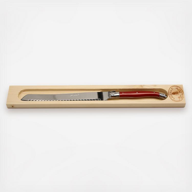 This bread knife, with it's ivory colored handle, is a great addition to any kitchen. The serrated edge helps it to slice through any type of bread with ease. After going through 25 production processes, this knife is stamped, polished, and packaged. It is rust resistant, dishwasher safe, and will last a lifetime.