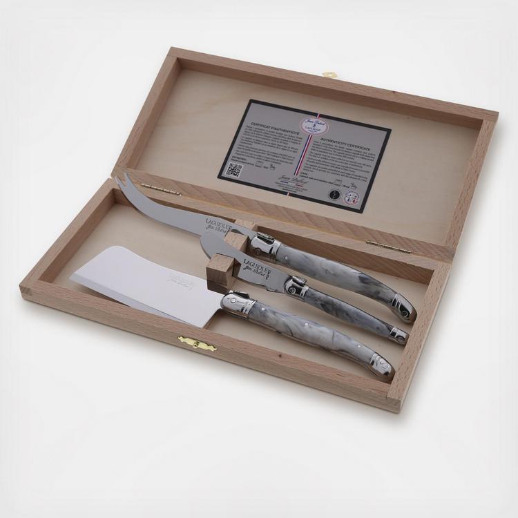 Never worry about your cheese set going out of style with this 3 piece stainless steel cheese set. The cleaver, cheese knife, and spreader are all dishwasher safe, rust resistant, and will last a lifetime. Each item in this set is put through 25 production stages, before they are stamped, polished, and packaged.