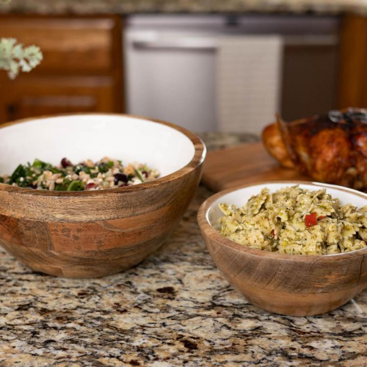 Crafted from high-quality mango hardwood, these versatile serving bowls are perfect for serving salads, fruits, or snacks and are sure to be a charming addition to any dining table or kitchen counter. The bowls are coated with a glossy white enamel that not only adds a sleek finish but also ensures durability and easy maintenance. The enamel also serves as a protective layer, making the bowl resistant to scratches and stains, ensuring it remains beautiful for years to come. They also nest together for easy storage