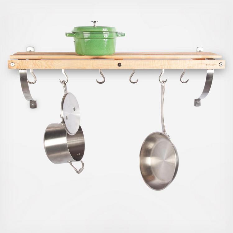 Store your favorite pots and pans on this convenient, wall-mounted rack. The compact Maple rack has a six-inch wide slatted shelf for display and additional top storage. Must be installed into solid wood.