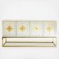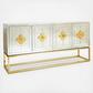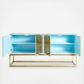 Minimalist forms meet Maximalist glamour. Antiqued mirror with a polished brass base. Two double-door compartments open to reveal a bright robin's egg blue interior fitted with two adjustable shelves. Quatrefoil handles and escutcheons add a decorative flourish to the simple form. Use reflective Delphine Credenza as a buffet in your dining room, place it behind your sofa as a chic console, or give your foyer the gift of glamour.