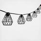 Add instant lighting to your patio, deck or balcony with our bright white Outdoor Caged Lights. 10 clear glass bulbs are spaced 12" apart along a 10' cord. Modern black diamond design can be used with a dimmer for softer lighting at a wedding, party, or camping. These Caged Lights have a metal enclosure to help them stand up to rain and wind. Leave them up all summer for entertaining outside, or keep them up all year in mild climates.