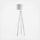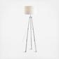 The timeless surveyor's tripod lamp is re-interpreted as a glamorous, modern floor lamp in glass and chrome. A statement piece for the living room, den, or office, this lamp features an linen drum shade and bright included LED bulb. A black silk-wrapped cord is an elegant finishing touch.