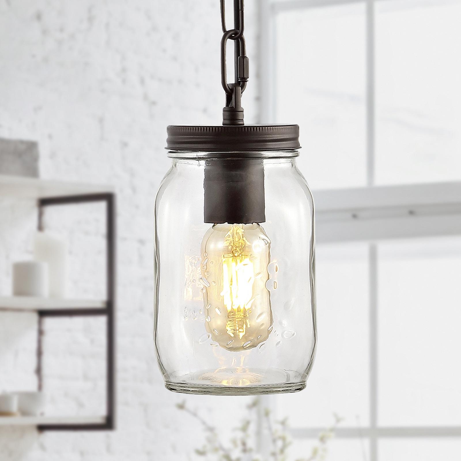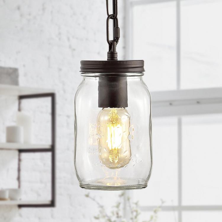 Add farmhouse flair to your kitchen or dining room with our Mason-jar Edison bulb ceiling light. A Single LED bulb in a glass jar provides plenty of warm light. Hanging chain and a bronze finish add rustic, industrial style to any room.