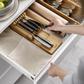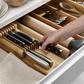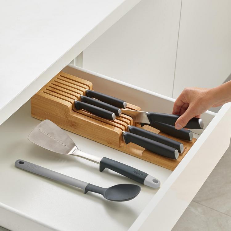 Storing sharp knives loosely in drawers can be dangerous and may also damage expensive blades. This 2-tier knife Organizer is the perfect solution providing both safe storage and easy access for a range of kitchen knives. It features two levels for different blade lengths and can hold up to nine knives in a neat, compact space. Non-slip feet on the base stop the unit from sliding around in your drawer. Made from beautiful, natural bamboo. Wipe clean with a damp cloth and dry by hand (do not soak). Oil regularly with a food-safe oil to maintain best condition. Suitable for knife blades up to 9 inches (23 cm). Suitable for drawers with a minimum height of 8.5 cm (3? inches).