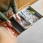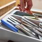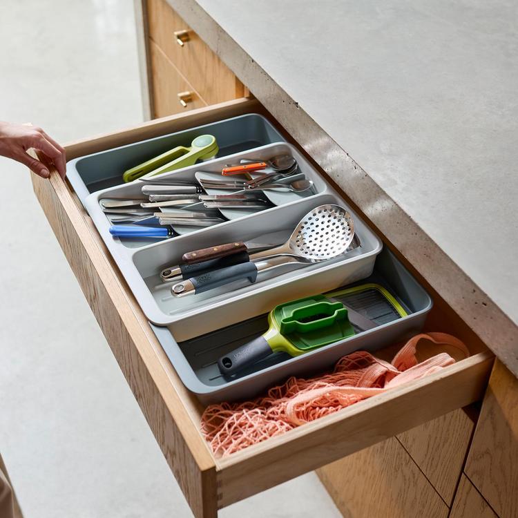 Organize messy cutlery drawers once and for all with this expanding tray. Innovatively designed to optimize your space, it includes a tiered organizer with icons for easy cutlery identification, a deep compartment for utensils and gadgets and side trays that extend to fit larger drawers. Made with a minimum of post-consumer recycled plastic.