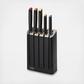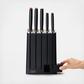 The Elevate™ range of kitchen tools is designed to improve hygiene and reduce mess. Each tool has an innovative weighted handle with an integrated tool rest, ensuring that the head or blade is always raised off the work surface, when placed down. This stylish set comprises five knives with Japanese stainless-steel blades and ergonomic handles plus a smart, slimline knife block. The block features easy-access knife slots and a removable, two-stage ceramic sharpener in the base. Simply push the side of the unit to release the sharpener when required. The sharpener features two ceramic wheels that sharpen and hone the blades, helping to keep them in optimum condition (not suitable for ceramic or serrated blades). After use, simply slide the sharpener back into place where a magnet holds it securely in place.