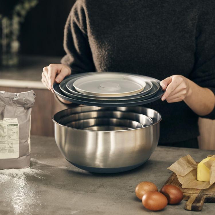 The Joseph Joseph 100 Collection is a unique range of products specially selected for their highly original form and innovative function. For this exclusive collection, each product has been redefined using premium materials and a restrained color palette to create a distinctive range of contemporary kitchenware. The innovative design of this Nest™ 100 Prep and Store bowl set allows the individual elements to be stacked neatly together, thereby occupying the absolute minimum amount of space when stored. This versatile bowl set not only looks great, but is ideal for a range of food preparation and storage tasks. Each bowl is made from high-quality 18/8 stainless steel and features easy-find, snap-together lids and non-slip bases. The largest bowl in the set also includes handy volume measurements on the inside.