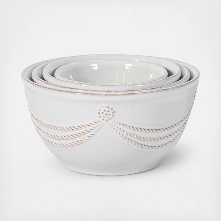 From our Berry & Thread Collection - From a petite portion of parsley to a draping bunch of grapes, our versatile and elegant nested set of prep bowls in whitewash keeps your kitchen organized and your secret ingredients close at hand. Dimensions of each bowl from smallest to largest: 1) 3"L x 3"W x 1.75"H, 2) 3.75"L x 3.75"W x 2"H, 3) 4.25"L x 4.25"W x 2.25"H, 4) 5"L x 5"W x 2.5"H