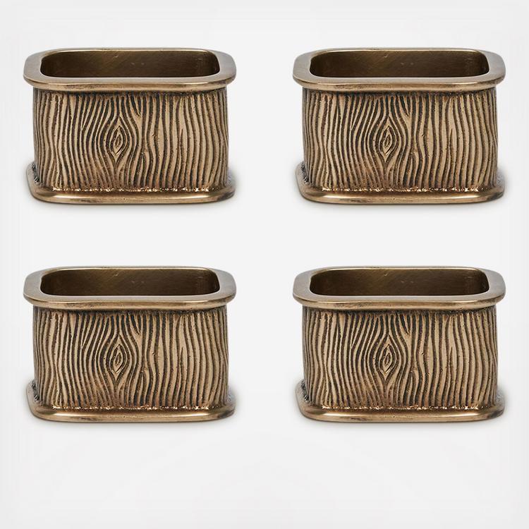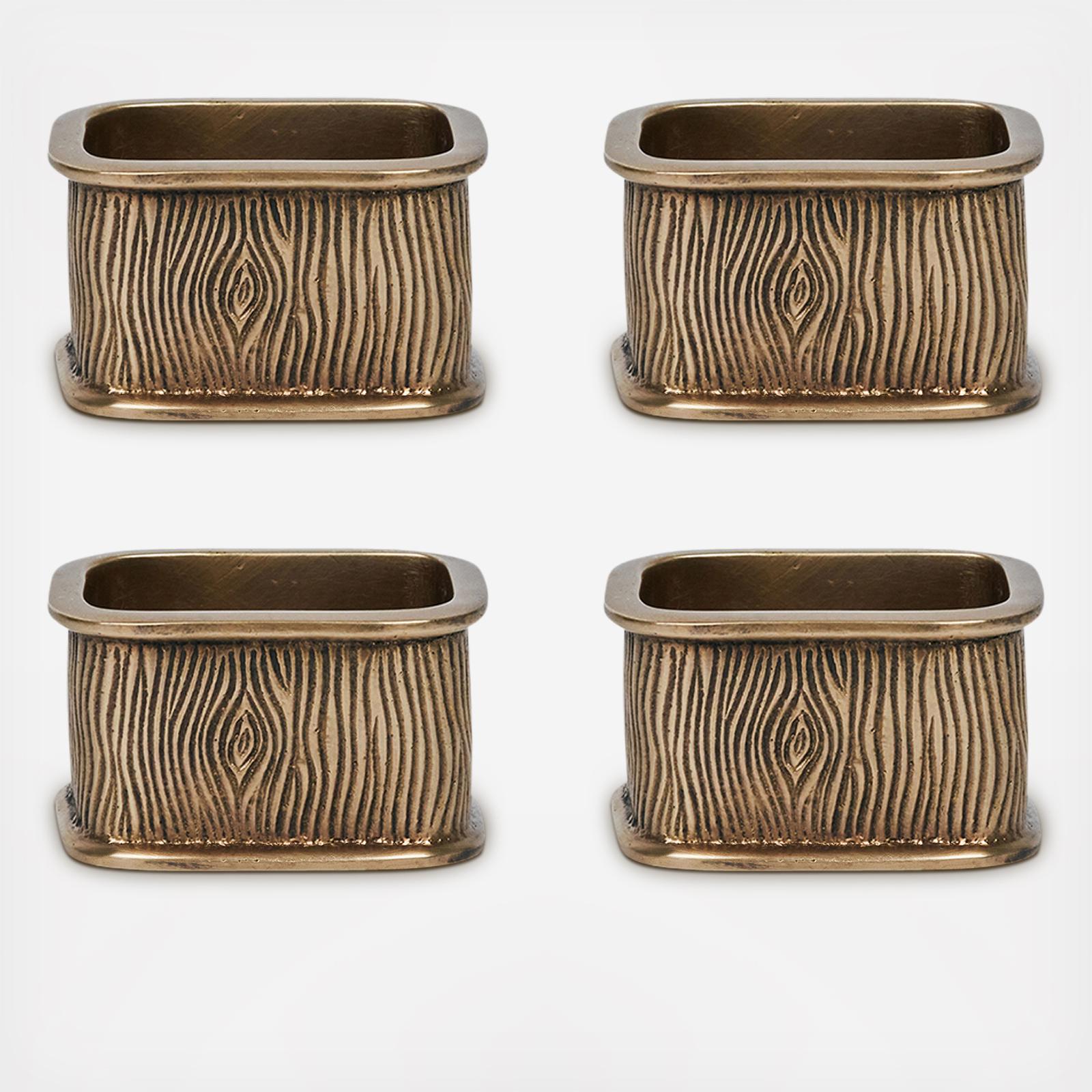 Elevate any setting with these striking brass napkin rings that are as stately as the mighty oak with their richly textural woodgrain motif.