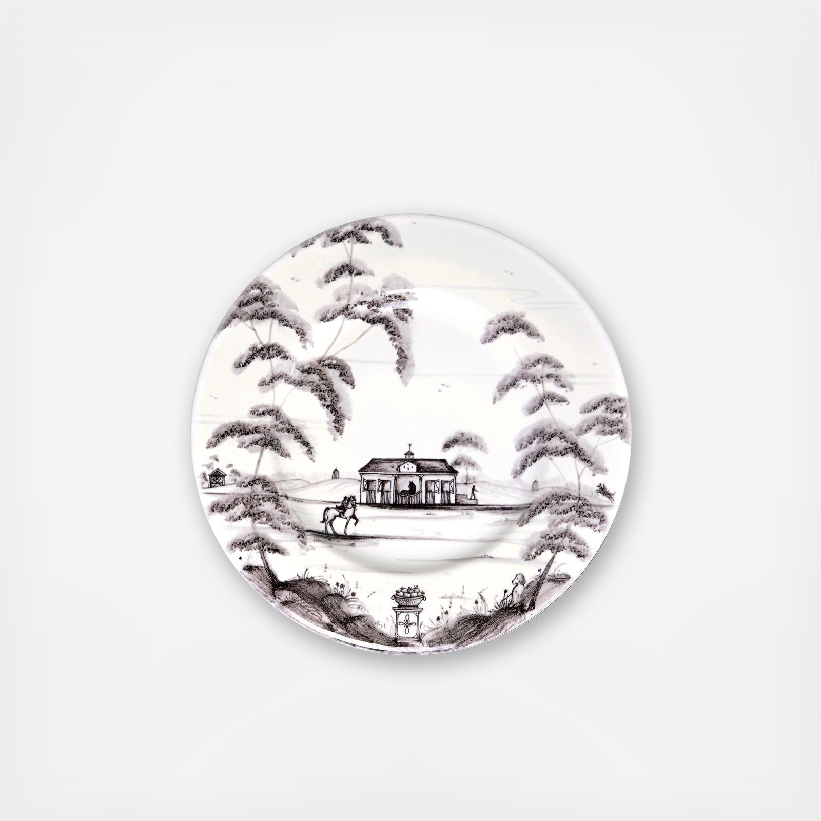 From Juliska's Country Estate Collection- a galavant across the fields on your favorite filly from Juliska's stables promotes rosy cheeks and stimulates the appetite. Juliska's side plate is the perfect companion to a slice of homemade bread, generously slathered with butter. Featuring Stable and Golf Hut.