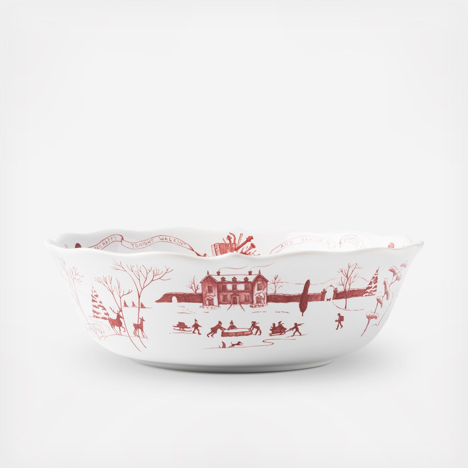 From our Country Estate Collection- Our charming English country estate is snow covered for the holidays! This serving bowl, ideal for serving sides or salads, depicts musical merry-making and dancing in the estate’s rear gardens.