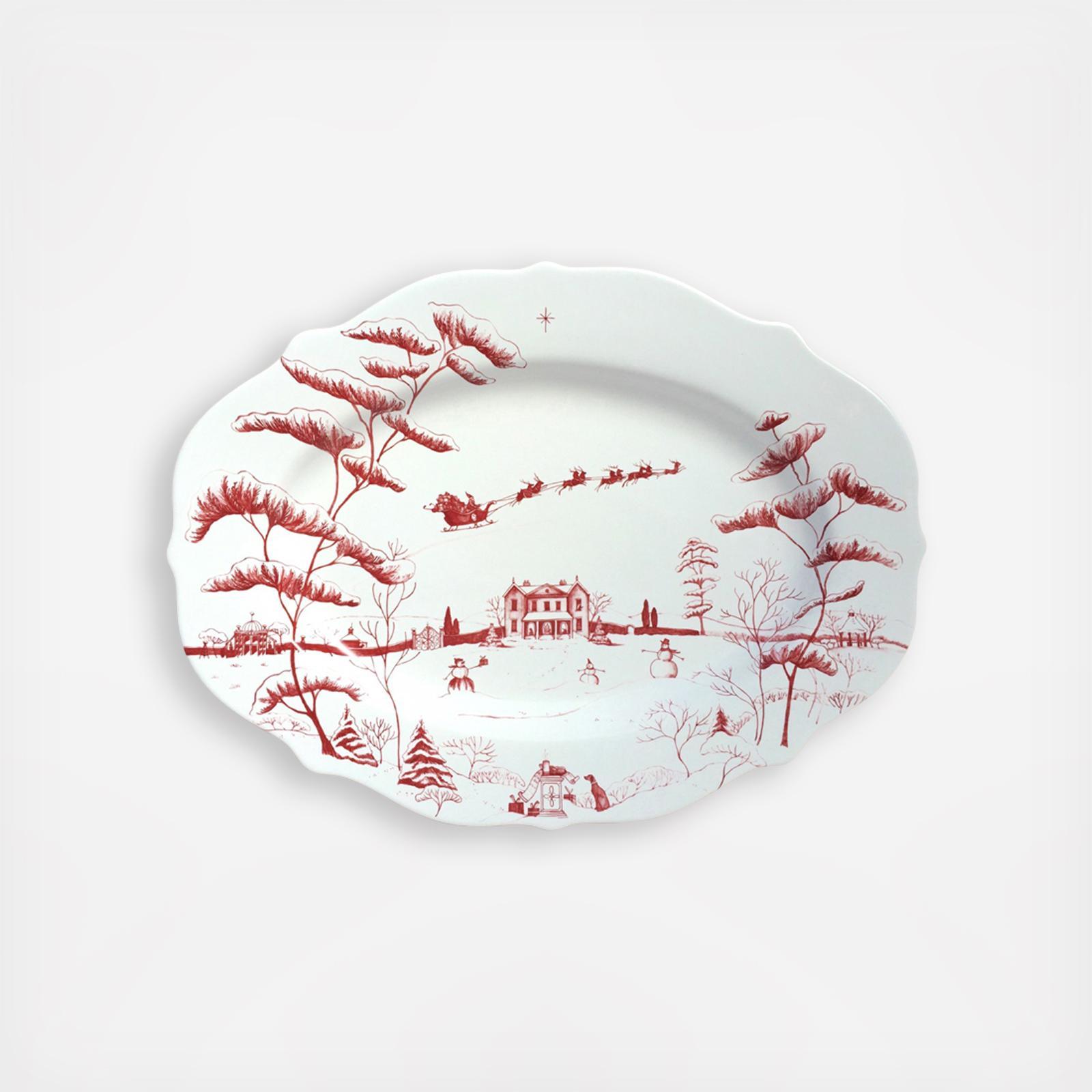 Country Estates Winter Frolic Ruby Serving Platter Christmas Eve offers a happy Christmas scene at the Main House in winter. Children will look with awe as Santa and the Reindeer fly over the wintery scene complete with snowmen. Perfect for serving the Christmas Turkey or Prime Rib. Pair with the rest of the Ruby Country Estates collection or use as a special accent. This will become a piece your family looks forward to using every Christmas season. Makes a wonderful gift for your favorite Christmas hostess.