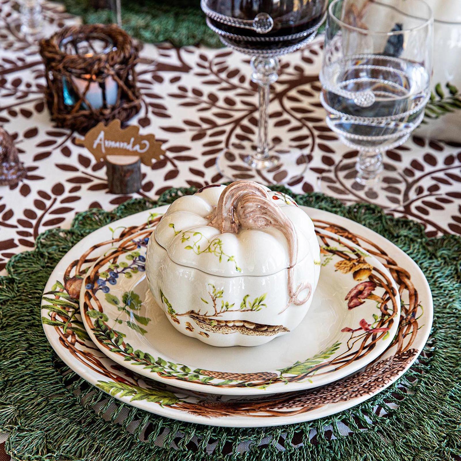 The most petite pumpkin in the patch, designed for individual servings of soups, stews, or desserts. Each lidded pumpkin is bedecked in the Forest Walk motif upon a creamy background to artistically capture the rich natural beauty of the season; it’s finished with a gorgeously curling tendril of a stem on top. These sculptural pumpkins are earthenware, therefore perfect for décor and serving, but not for cooking.