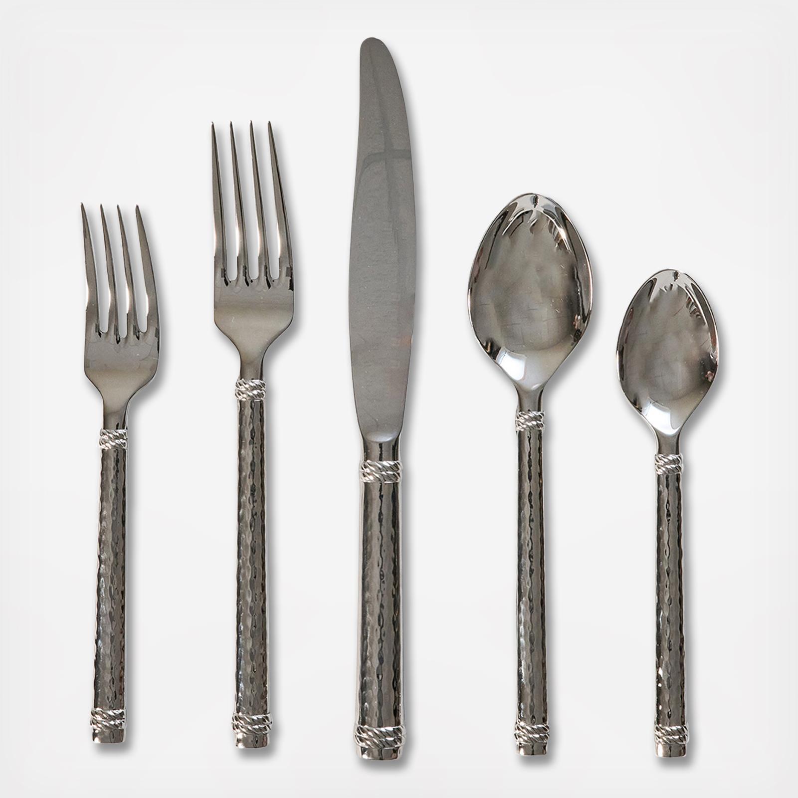 This striking flatware gleams with its distinctive dimpling effect in hammered stainless steel, polished to brilliance, and finished with a tidy trimming of simple thread. Sophisticated and stunning, Graham is a masterclass in casually formal entertaining, perfect for everyday settings to holiday feasts.
