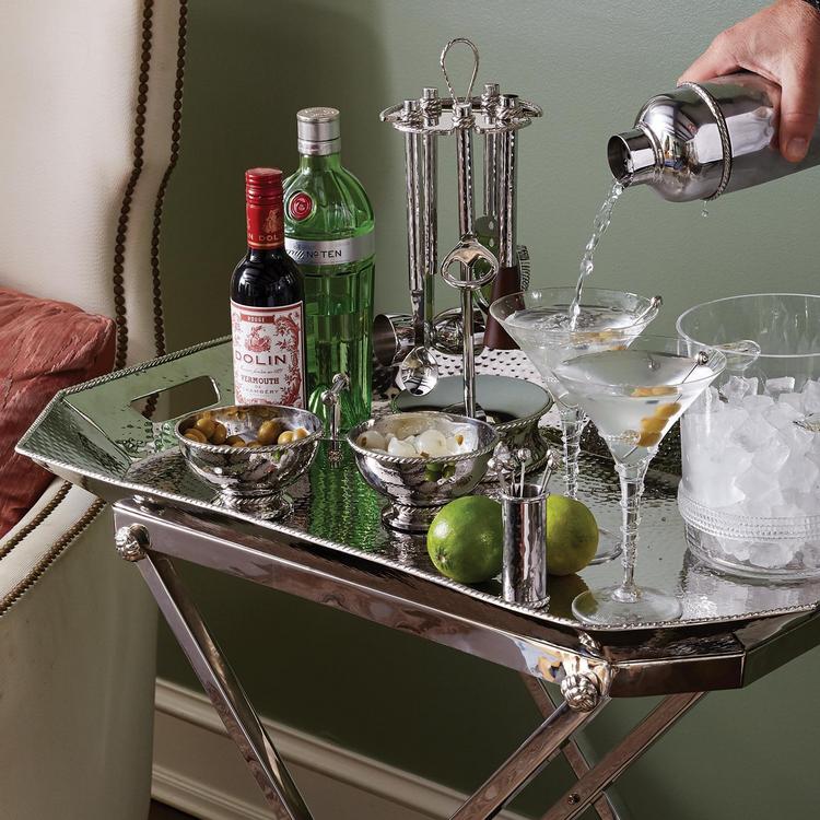 Decorated with a tidy trimming of simple thread, each piece in our Graham barware collection is handmade in hammered stainless steel and polished to brilliance. This set of eight cocktail picks with accompanying holder works wonderfully for skewering a maraschino cherry or olive for your favorite craft cocktail. Each pick is adorned with a decorative finial.