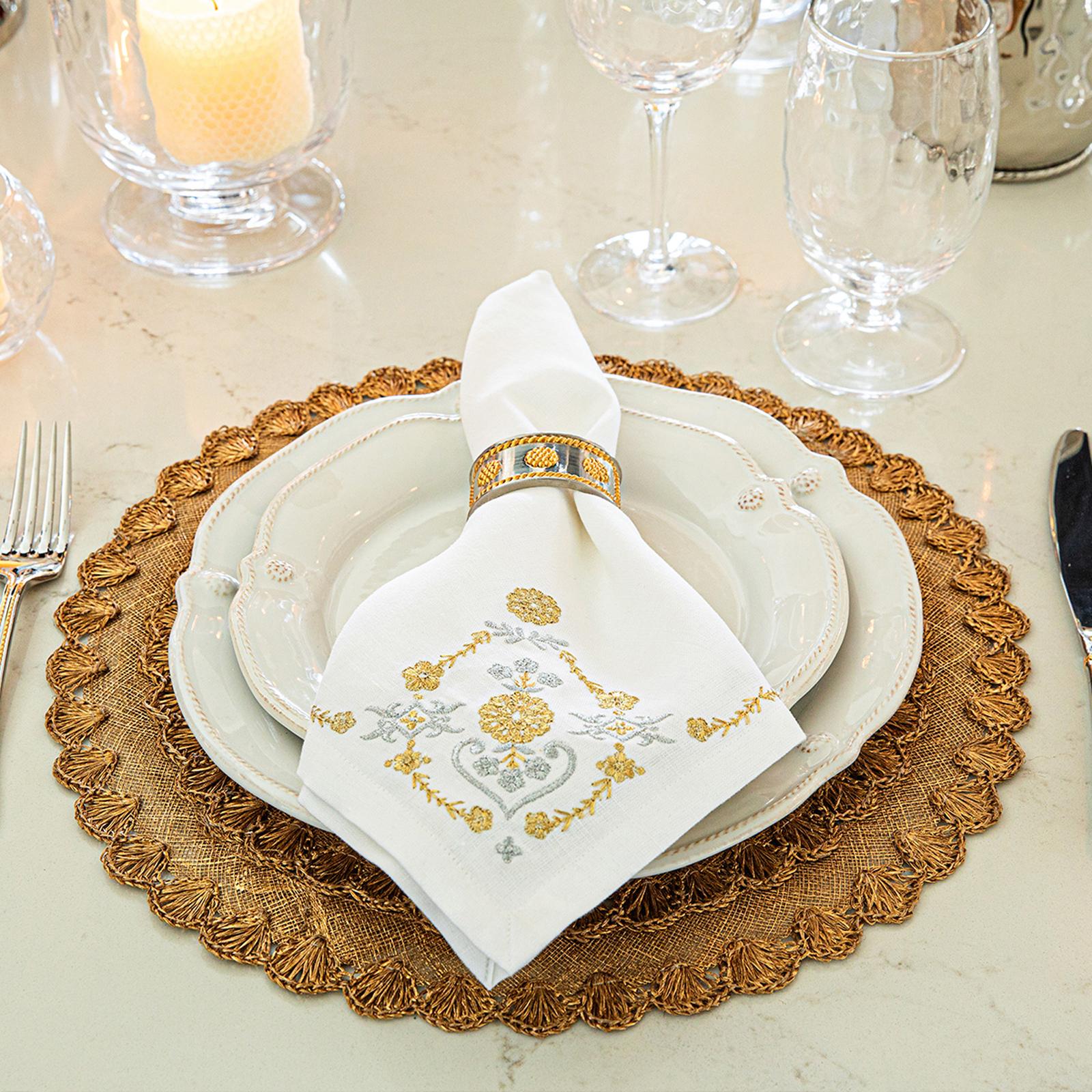 Evocative of inherited heirlooms, these linen napkins of woven cotton feature subtly stunning embroidery at the corner (perfect placement for styling within napkin rings) in an intricate floral motif that adds instant easy elegance to any table.