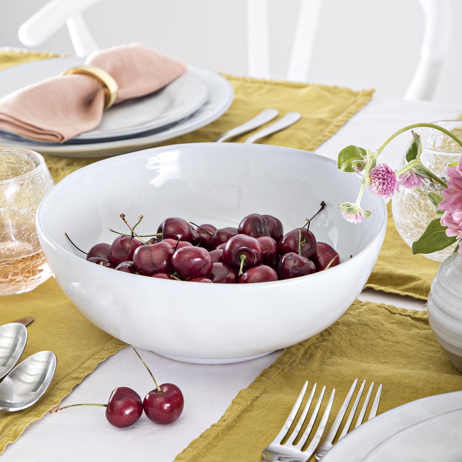 From our Quotidien Collection - From crisp green apples to mounds of heirloom tomatoes, our serving bowl provides a bountiful nest for your farmer's market treasures. This lustrous white mainstay perfectly compliments all of our collections.